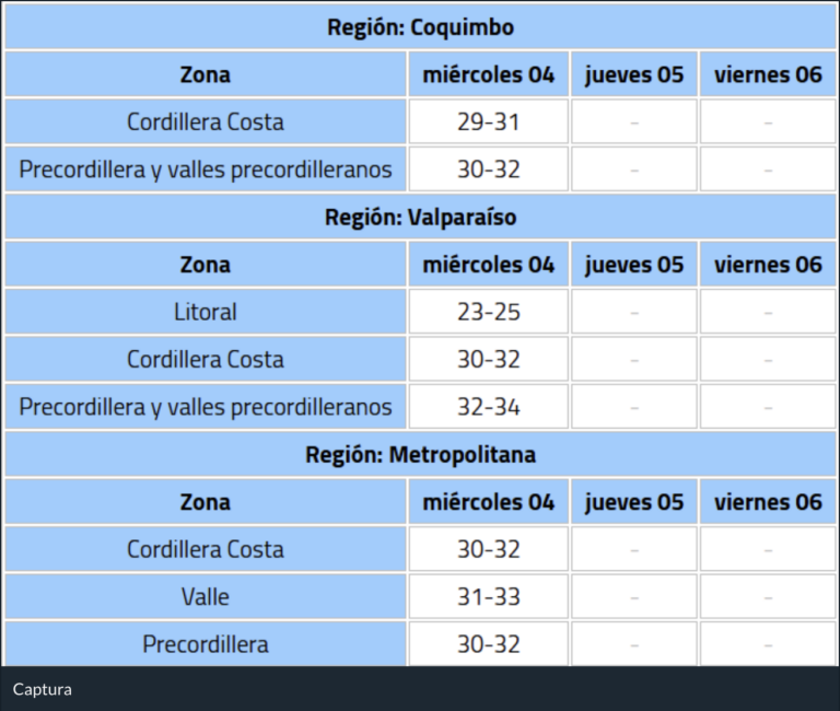 La Dirección Meteorológica de Chile ha emitido avisos de altas temperaturas para 9 regiones del país entre el miércoles y viernes, coincidiendo con la vuelta a clases. En algunas zonas se alcanzarán los 34 °C, por lo que se recomienda incluir bloqueador solar en los preparativos. Las regiones afectadas incluyen Coquimbo, Valparaíso, Metropolitana, O’Higgins, Maule, Ñuble, y Bío Bío, con picos de temperatura distribuidos entre estos días. En Isla de Rapa Nui se esperan entre 27 y 29 °C, mientras que en La Araucanía y Los Ríos se alcanzarán los 32 °C el viernes.