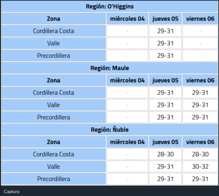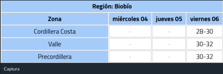 El reporte afecta a las regiones de Coquimbo, Valparaíso, Metropolitana, O’Higgins, Maule, Ñuble y Bío Bío. Mientras que algunas de ellas tendrán el peak de temperaturas este miércoles, en otras será el jueves, el viernes o ambos días.