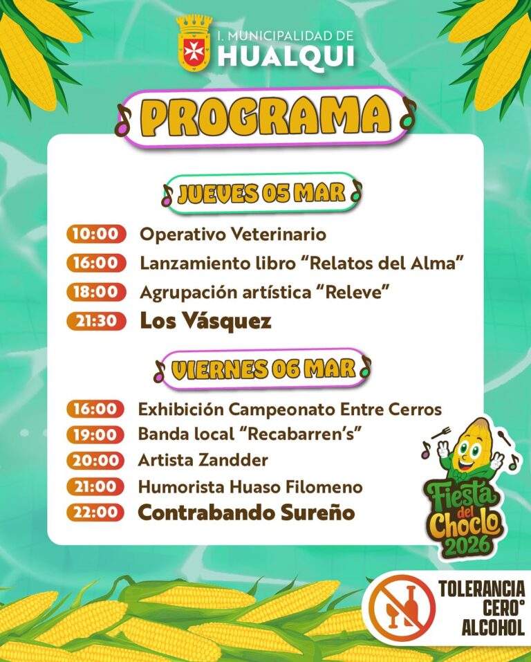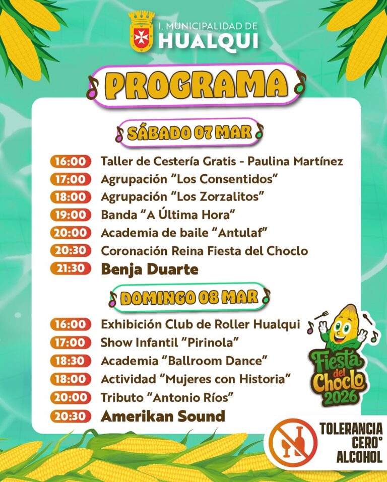 La Fiesta del Choclo de Hualqui se extiende hasta el domingo 8 de marzo, con una variada programación que incluye música en vivo, gastronomía típica, artesanía y actividades culturales.