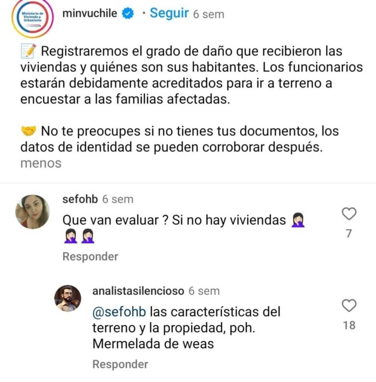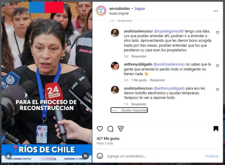 En medio de la catástrofe por los incendios forestales y el drama de miles de familias que perdieron sus viviendas, las publicaciones de la cuenta oficial de Instagram del Servicio de Vivienda y Urbanización (Serviu) de la región del Biobío (@ServiuBioBio), comenzaron a llenarse de comentarios negativos. Y es que mucha gente utilizó ese medio para descargar la frustración propia de no tener un techo donde vivir o para buscar respuestas de las autoridades. Pero lo que encontraron, lejos de información concreta, fue hostilidad, ironía y trato denigrante.