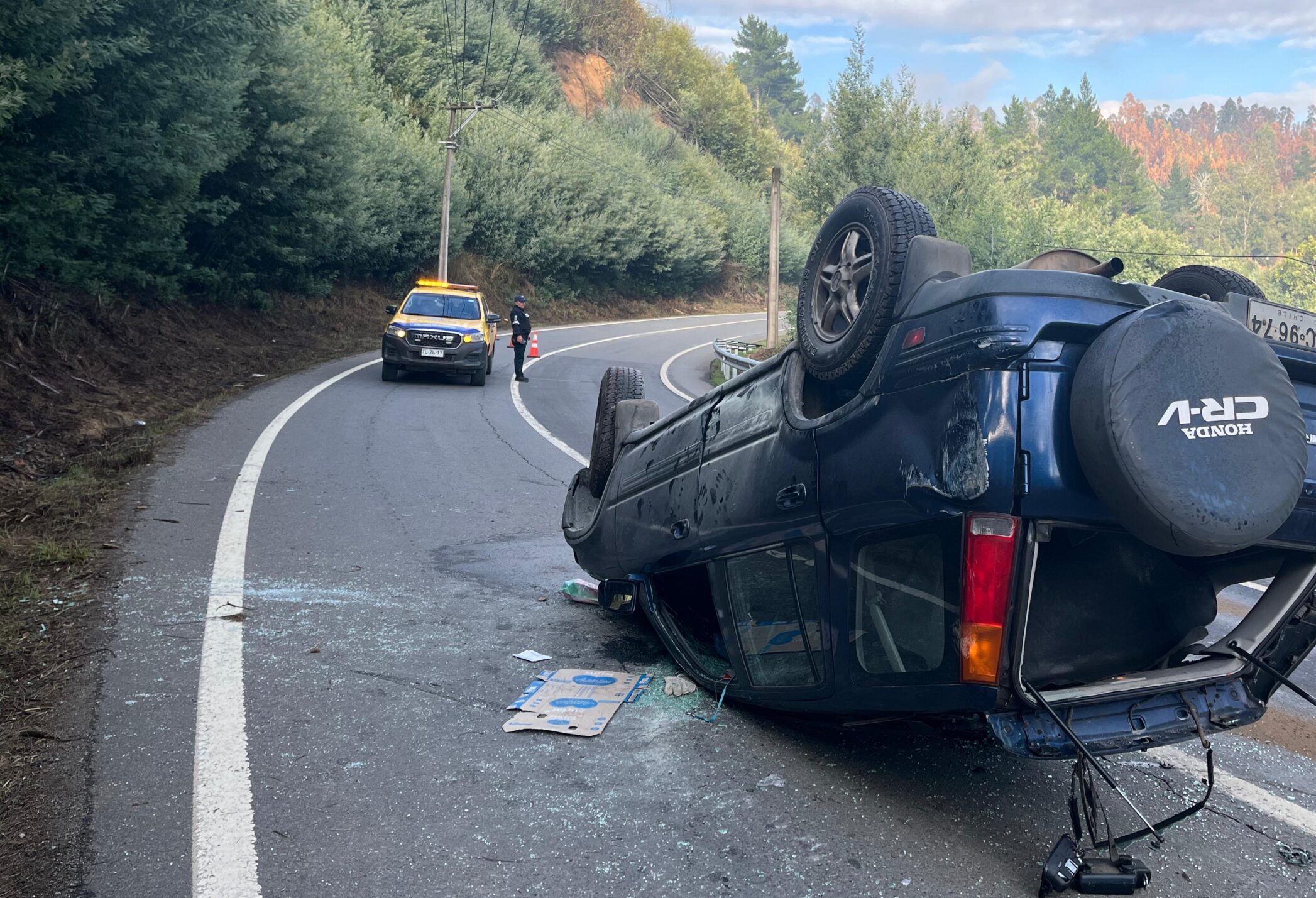 En el lugar, un vehículo menor terminó volcado, luego de que su conductora —una mujer de aproximadamente 55 años— se habría descompensado mientras manejaba. Según información entregada por Carabineros, la persona sufriría de diabetes.