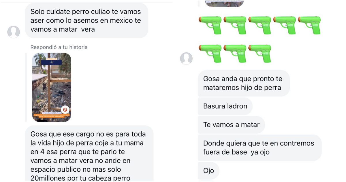 Mediante un comunicado de prensa, el municipio señaló que el jefe comunal recibió mensajes de grueso calibre. “Te vamos a matar”, “te vamos aser como lo asemos en mexico te vamos a matar”, “no ande en espacio público solo” y “20 millones por tu cabeza perro maldito”.