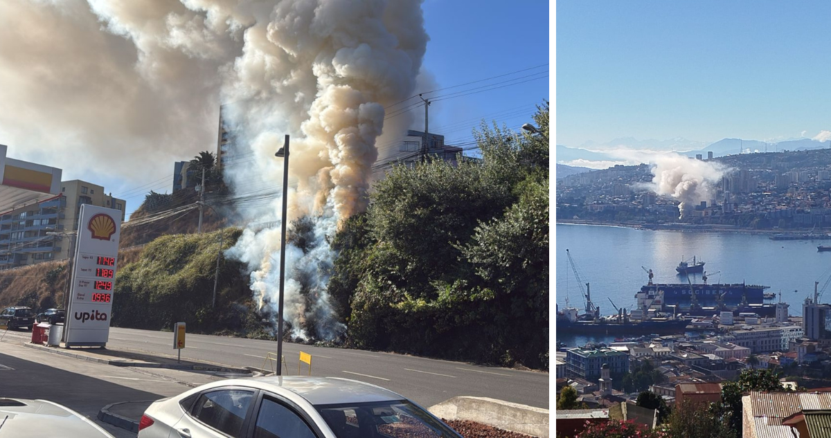 Un incendio de características forestales-urbanas de interfaz se registra en el sector de la pasarela Yolanda I con avenida España, en la comuna de Valparaíso.