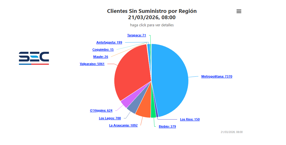 Según el último reporte de la Superintendencia de Electricidad y Combustibles (SEC), a las 08:00 de la mañana de este sábado 21 de marzo hay un total de 7.370 clientes sin suministro eléctrico en la región Metropolitana. En tanto, en la región de Valparaíso la cifra es de 5061.