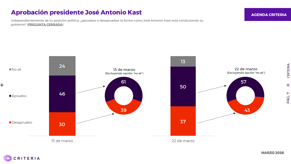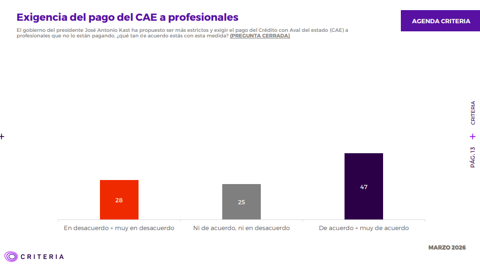 Una nueva versión de la Encuesta Criteria, reveló que un 57% de la muestra aprueba la gestión del Gobierno de José Antonio Kast, mientras el 47% está de acuerdo con exigir el pago del Crédito con Aval del estado (CAE) a profesionales que no lo están pagando. Además, el 45% está en desacuerdo con que Kast está evaluando indultar a algunos carabineros y militares condenados por delitos cometidos durante el estallido social de 2019.