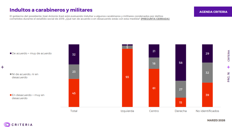Por otra parte, ante la pregunta “El gobierno del presidente José Antonio Kast está evaluando indultar a algunos carabineros y militares condenados por delitos cometidos durante el estallido social de 2019. ¿Qué tan de acuerdo o en desacuerdo estás con esta medida?”, un 45% está en desacuerdo y un 32% en desacuerdo.