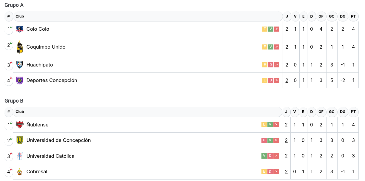 En el A, los que mandan son Colo Colo y Coquimbo Unido. Albos y piratas ganaron esta segunda fecha y comparten la cima, mientras que Huachipato y Deportes Concepción siguen sin sumar de a tres.