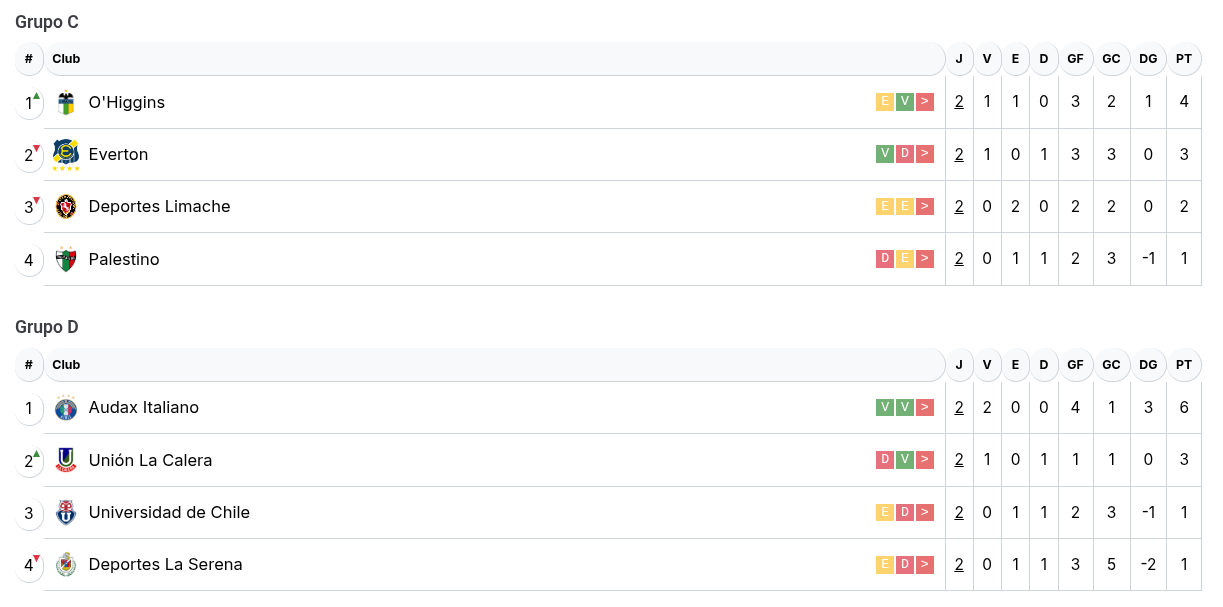 Por último, el Grupo D es liderado por Audax Italiano, único equipo que ha ganado los dos encuentros de la Copa de la Liga.