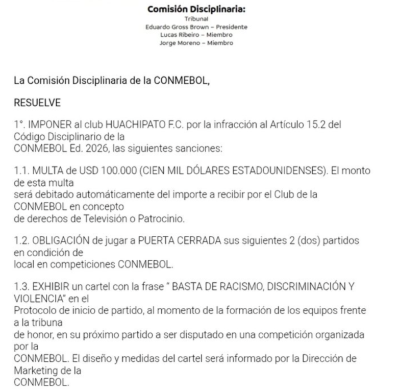El castigo es doble y contundente. Por un lado, una multa de 100 mil dólares que será descontada directamente de sus ingresos por competiciones internacionales. Además, Huachipato deberá disputar sus próximos dos partidos internacionales como local sin público.