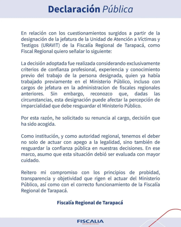 Además, la Fiscal Regional reconoció que, dadas las circunstancias, esta designación puede afectar la percepción de imparcialidad que debe resguardar el Ministerio Público. Por esta razón, informó que solicitó la renuncia al cargo, decisión que fue acogida por la funcionaria.