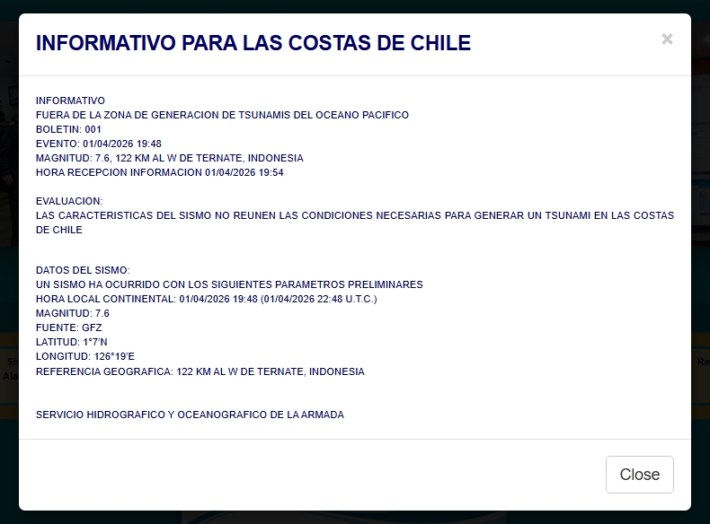 Desde Chile, el Servicio Hidrográfico y Oceanográfico de la Armada (SHOA) descartó cualquier riesgo de tsunami para las costas nacionales.