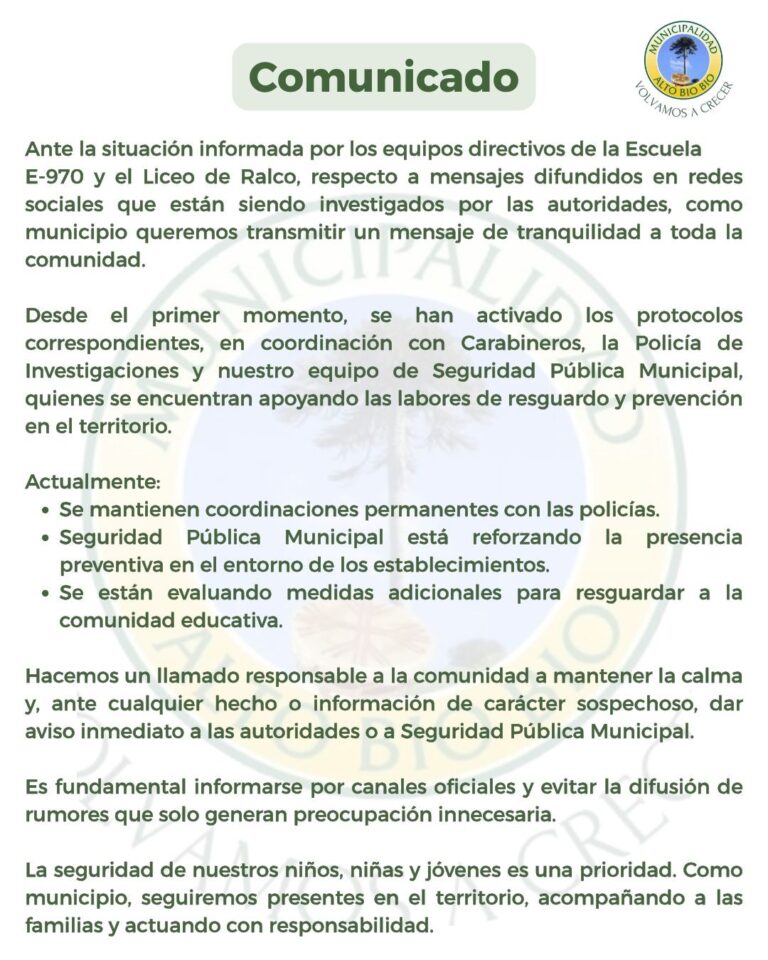 A través de un comunicado, la Municipalidad de Alto Biobío informó que, tras conocer estos antecedentes, se activaron de inmediato los protocolos correspondientes en coordinación con Carabineros, la Policía de Investigaciones y el equipo de Seguridad Pública Municipal.