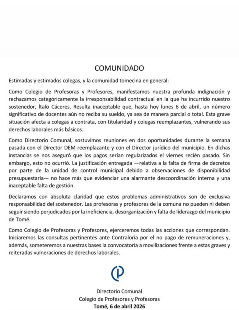 El comunicado fue emitido por el Directorio Comunal del Colegio de Profesoras y Profesores de Tomé y está fechado el 6 de abril de 2026.
