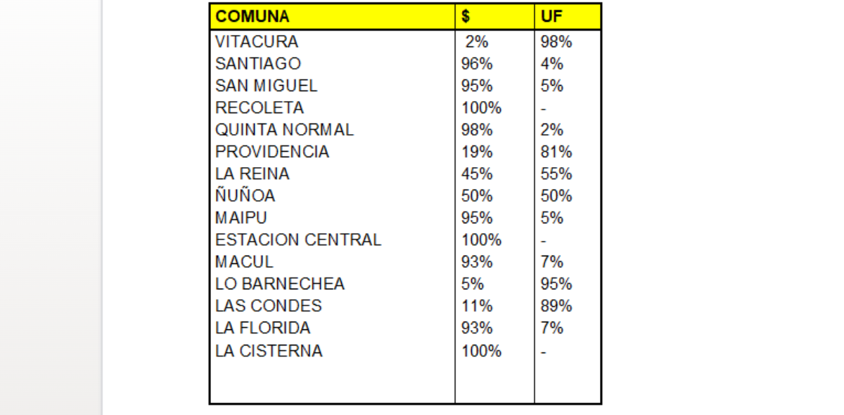 Asimismo, se registran comunas donde la tendencia es mixta: Ñuñoa, por ejemplo, concentra un 50% de sus arriendos pesos.