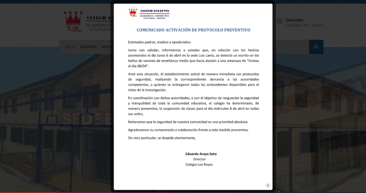 En el caso de Quilpué, en el Colegio Pasionistas también se detectó un mensaje de advertencia de similares características, lo que también activó rondas preventivas en el recinto.