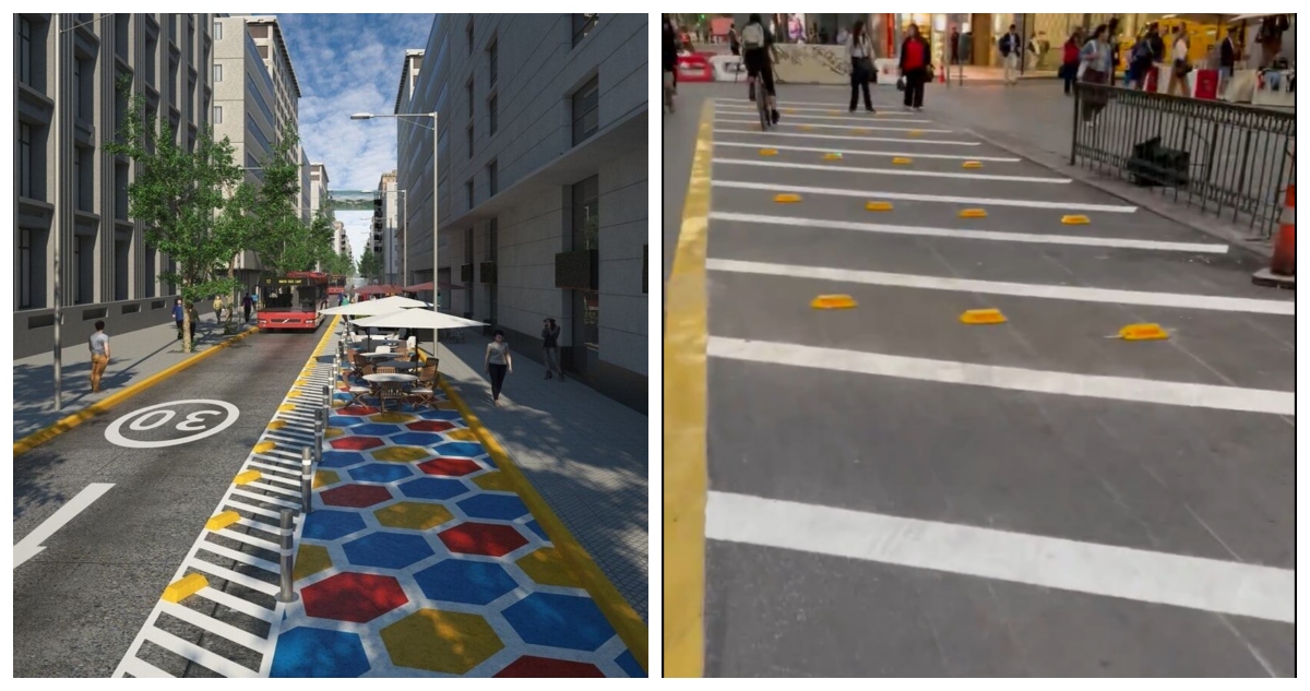 Si bien la foto del proyecto mostraba que las pistas de Bandera se dividirían en una peatonal y otra para buses, no obstante, la primera tiene tachas y achurado para que no circulen autos ni personas.