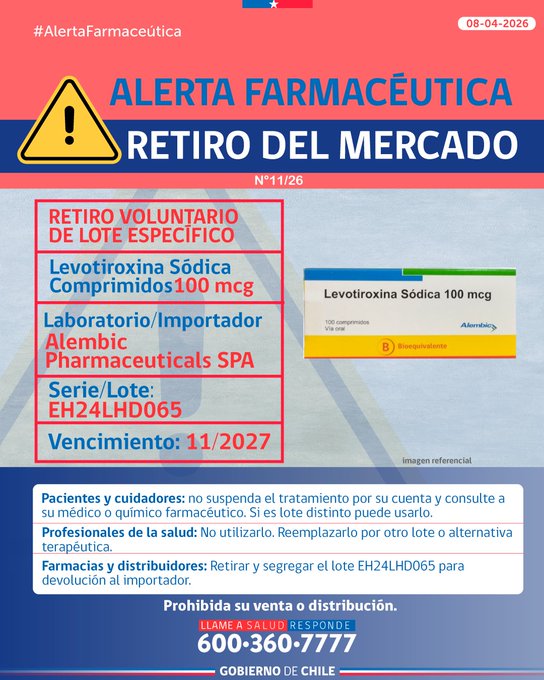 El Instituto de Salud Pública (ISP) emitió la Alerta Farmacéutica N°11/26, instruyendo el retiro del mercado de un lote específico de Levotiroxina Sódica de 100 mcg, medicamento utilizado en el tratamiento de enfermedades tiroideas.