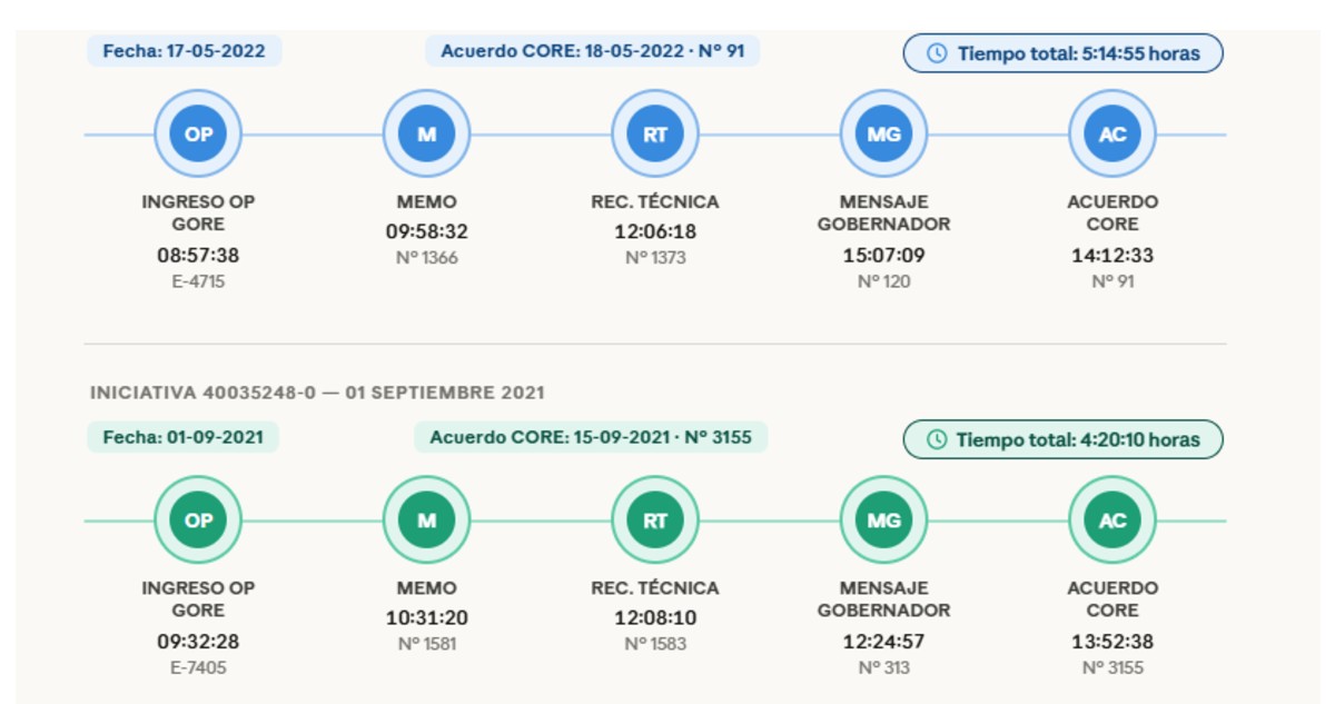 La cronología incluye la presentación de los proyectos con la solicitud de recursos, la designación del comité evaluador, el informe de admisibilidad de parte del aludido comité, la recomendación técnica de parte del Jefe DIPLADER al administrador, para la confección del respectivo mensaje, hasta el envío del oficio de mensaje de parte del Gobernador al Consejo Regional para su aprobación.