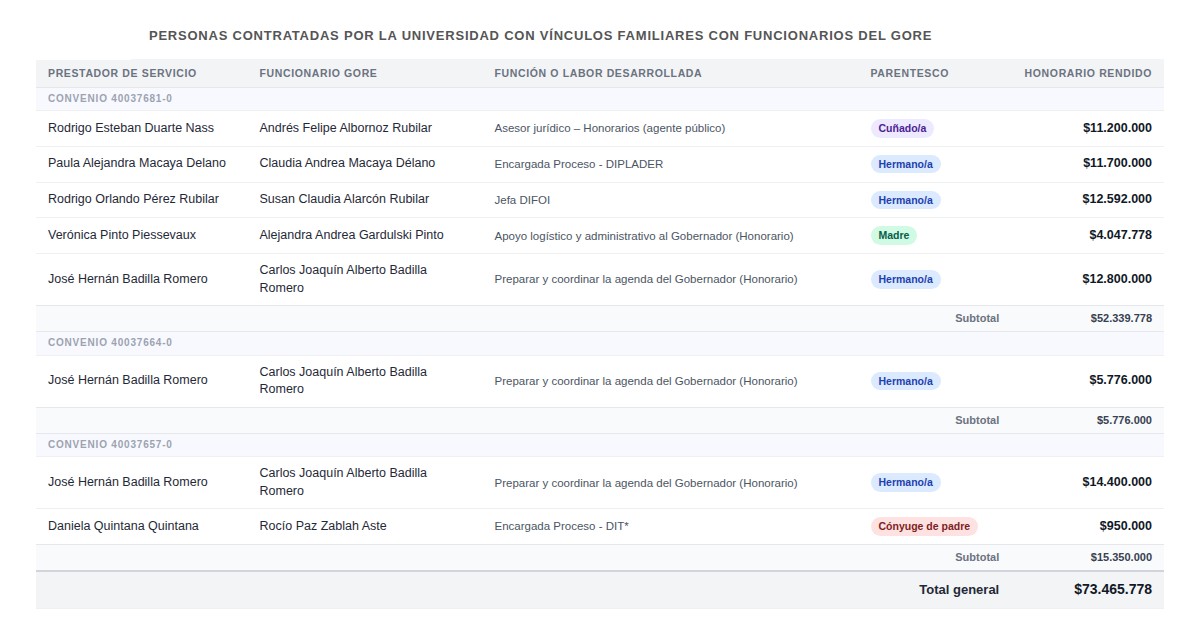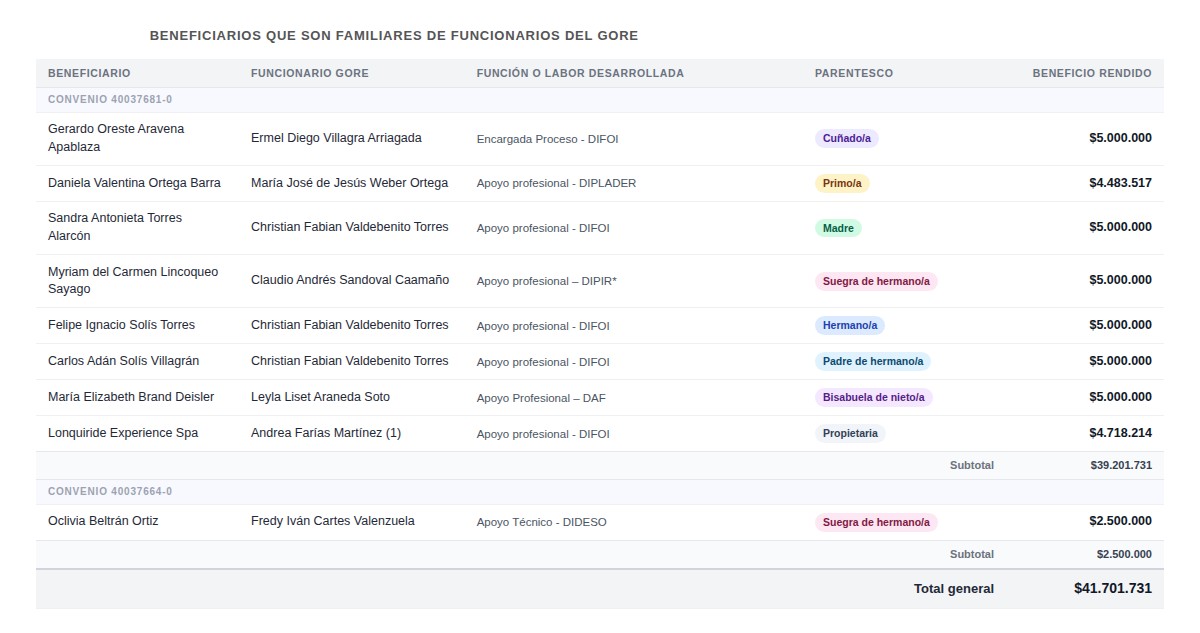 Hasta ahí, todo bien. Sin embargo, los resultados de la auditoría de la Contraloría revelaron escasos mecanismos de control al interior del GORE que pudieran detectar eventuales conflictos de interés respecto de funcionarios y sus relaciones de parentesco. Y es que, precisamente, el cruce de la red familiar de los empleados del GORE permitió advertir varios cruces que podrían ser problemáticos.