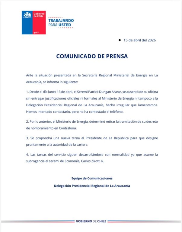 A través de un comunicado, informaron que desde el 13 de abril el seremi se ausentó de su oficina sin entregar justificaciones oficiales ni formales al Ministerio de Energía ni tampoco a la Delegación Presidencial.