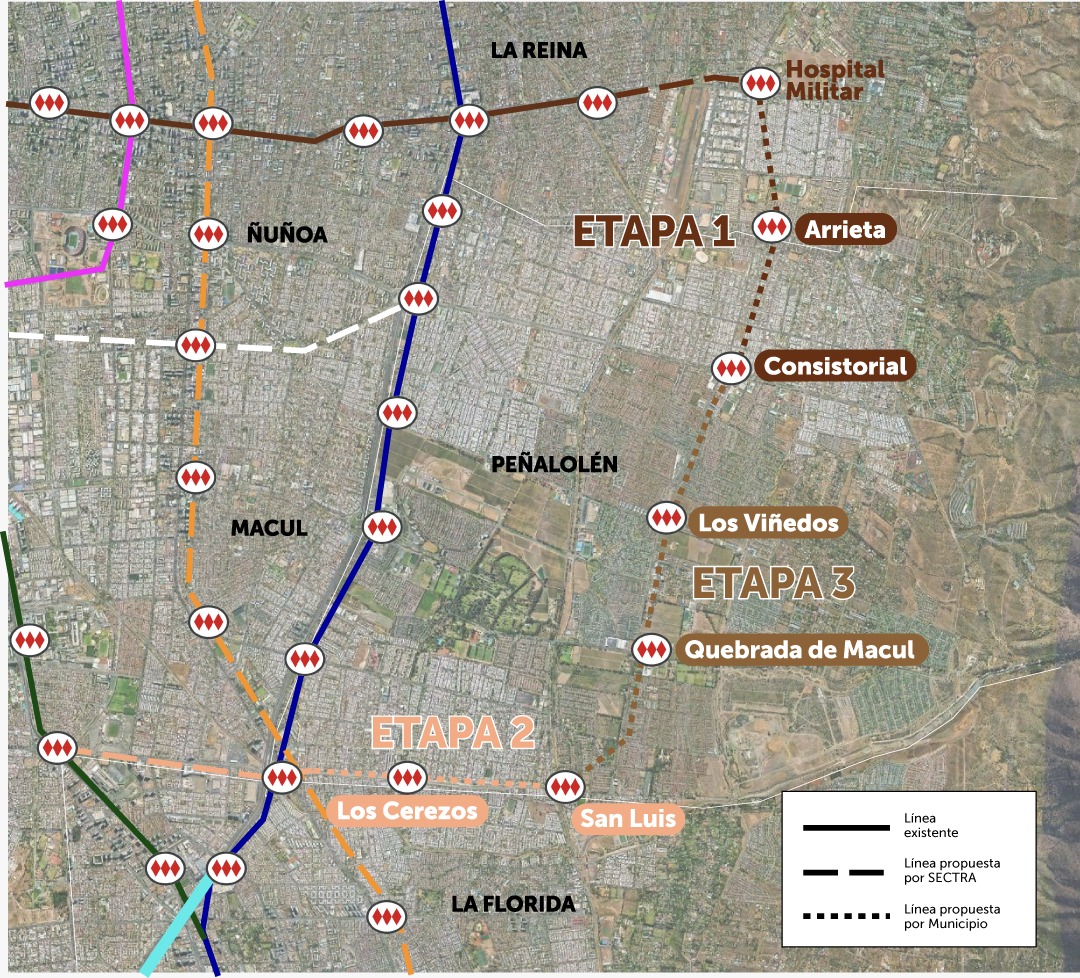La primera fase de la iniciativa incorporaría dos nuevos terminales, los cuales serían Arrieta y Consistorial. Este último se encontraría emplazado en la manzana municipal de Peñalolén.