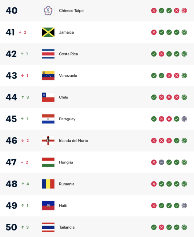 El salto al puesto 44 le permite a Chile afirmarse como la quinta fuerza de Sudamérica, aún detrás de Brasil, Colombia, Argentina y Venezuela, pero cada vez más cerca de ese grupo.