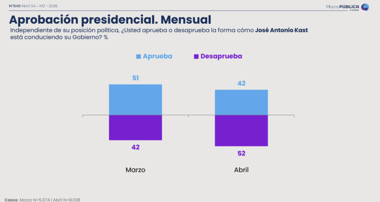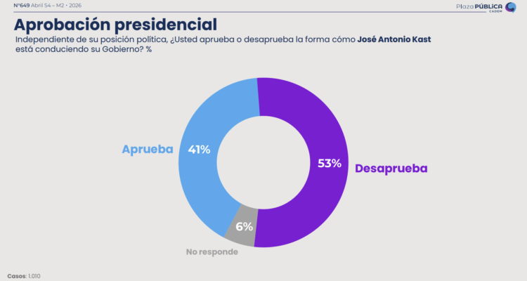 En una nueva edición de la encuesta Plaza Pública de Cadem correspondiente a la cuarta semana de abril, un 41% (-1 pto) de los encuestados aprueba la gestión del presidente José Antonio Kast. En tanto, un 53% (+3 pts) la desaprueba, cerrando el mes con un promedio de 42% (-9 pts) de aprobación.