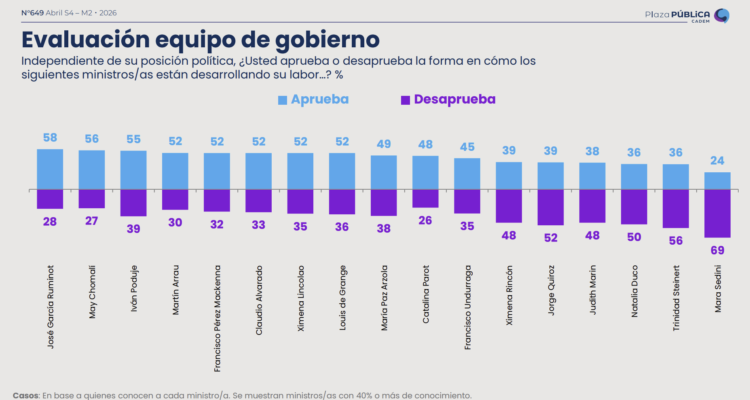 Respecto a la evaluación del gabinete, la ministra secretaria general de Gobierno, Mara Sedini, cayó 18 puntos en un mes, consolidándose con un 24% y es la secretaria de Estado peor evaluada.