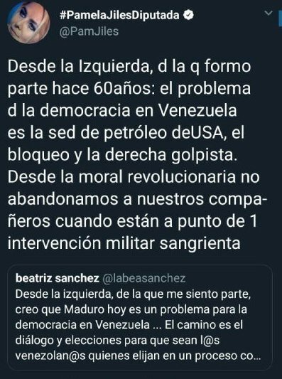 “Desde la izquierda, de la que formo parte hace 60 años: el problema de la democracia en Venezuela es la sed de petróleo de USA, el bloqueo y la derecha golpista. Desde la moral revolucionaria no abandonamos a nuestros compañeros cuando estàn a punto de una intervención militar sangrienta”.