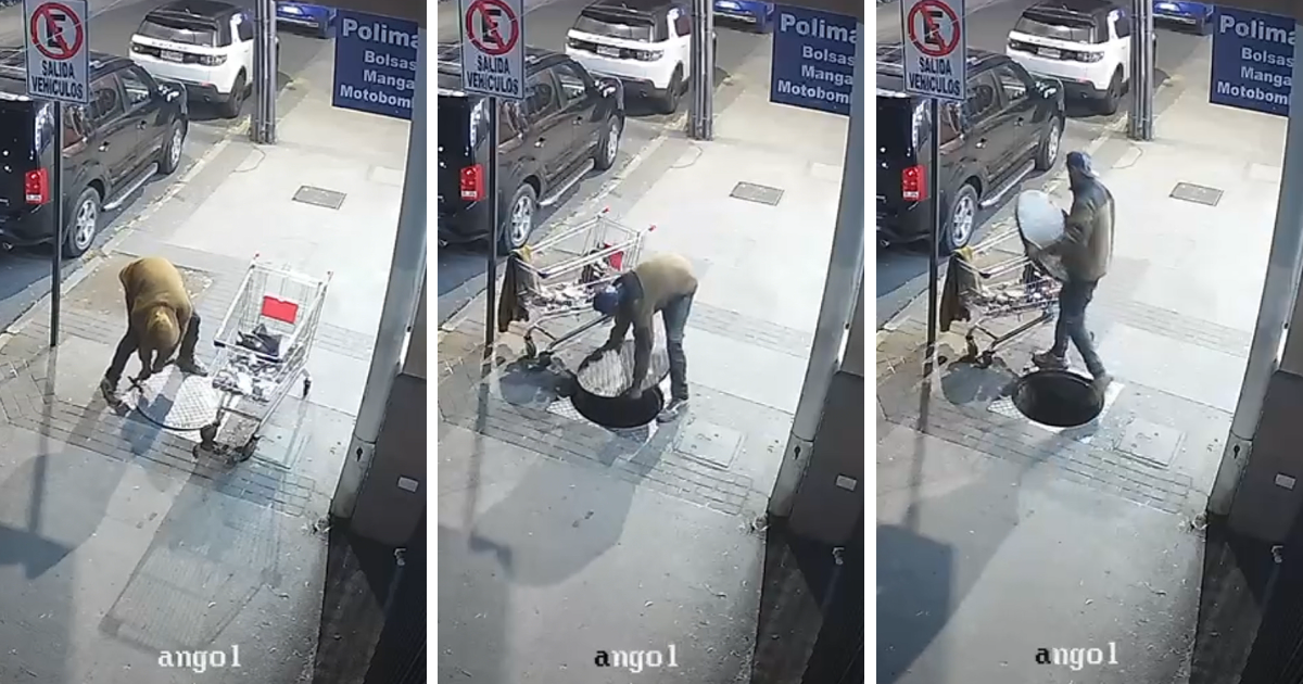 En las imágenes se observa a un hombre que se desplaza con un carro de supermercado, en cuyo interior transporta herramientas. El sujeto se detiene en plena vía pública, manipula la estructura y retira la tapa de una cámara subterránea, para luego continuar su recorrido.