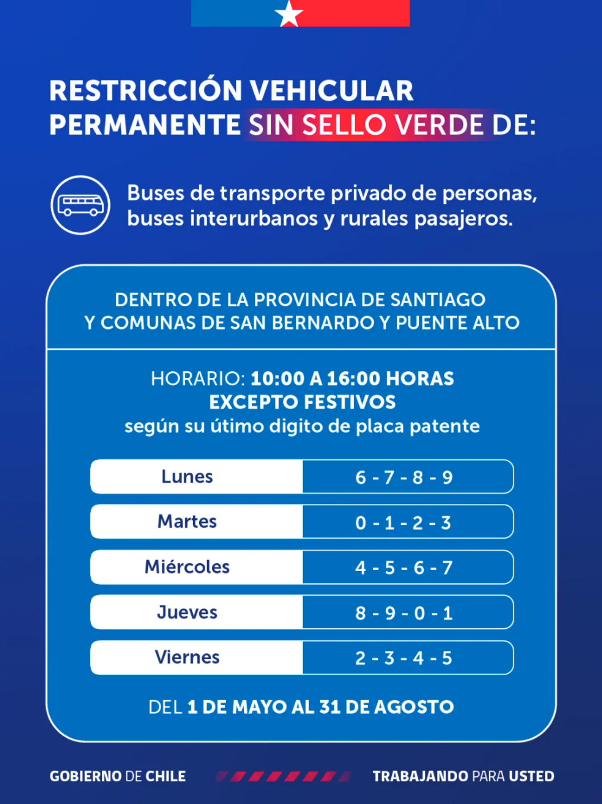 Para los buses sin sello verde, esta aplicará para la provincia de Santiago más San Bernardo y Puente Alto, entre las 10:00 y 16:00.