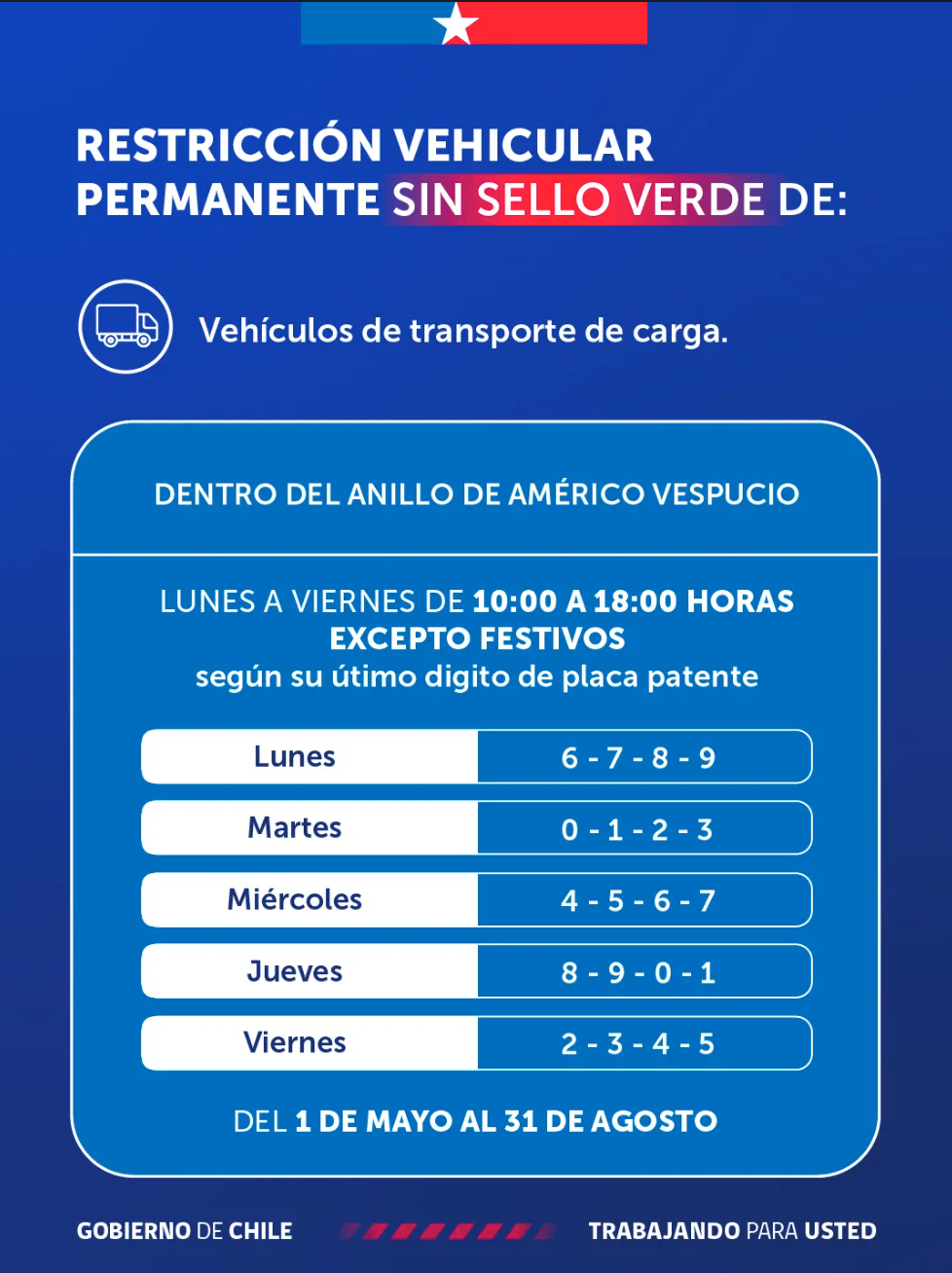 En tanto, para los camiones sin sello verde aplicará de 10:00 a 18:00, dentro del anillo Américo Vespucio.