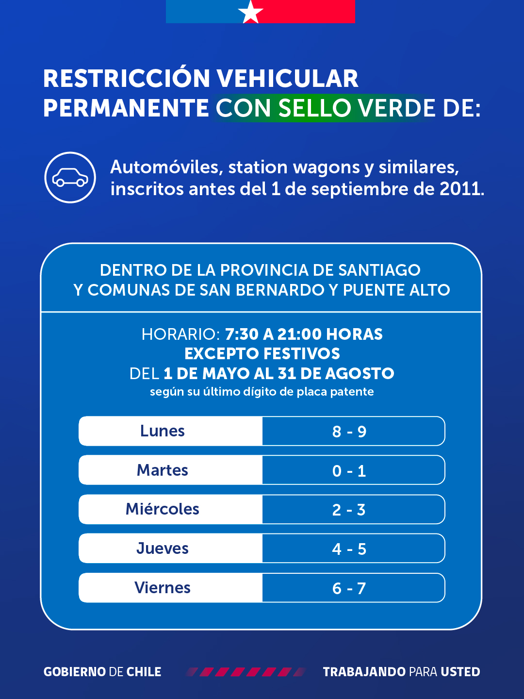 Además, hay un calendario de cuatro dígitos para por el resto de la provincia de Santiago; más las comunas de San Bernardo y Puente Alto.