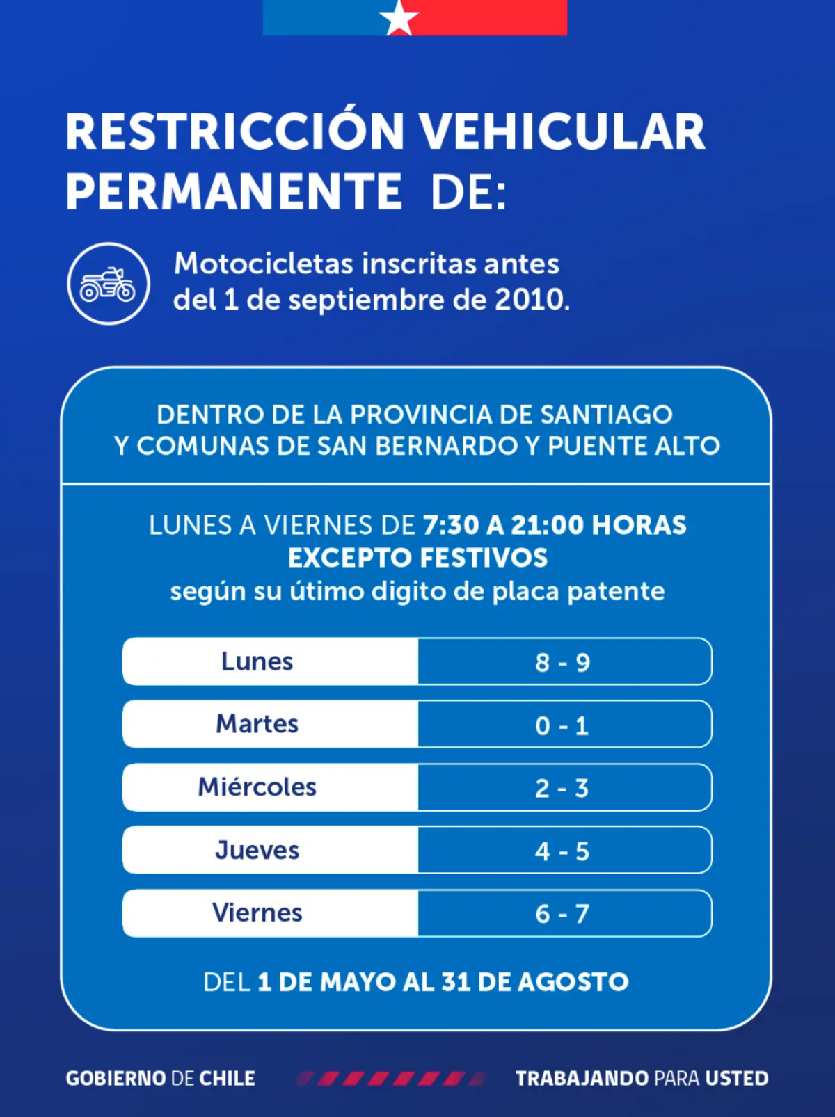 También hay calendario de dos dígitos para las motos inscritas antes del 1 de septiembre de 2010. Esto en la provincia de Santiago más las comunas de San Bernardo y Puente Alto.