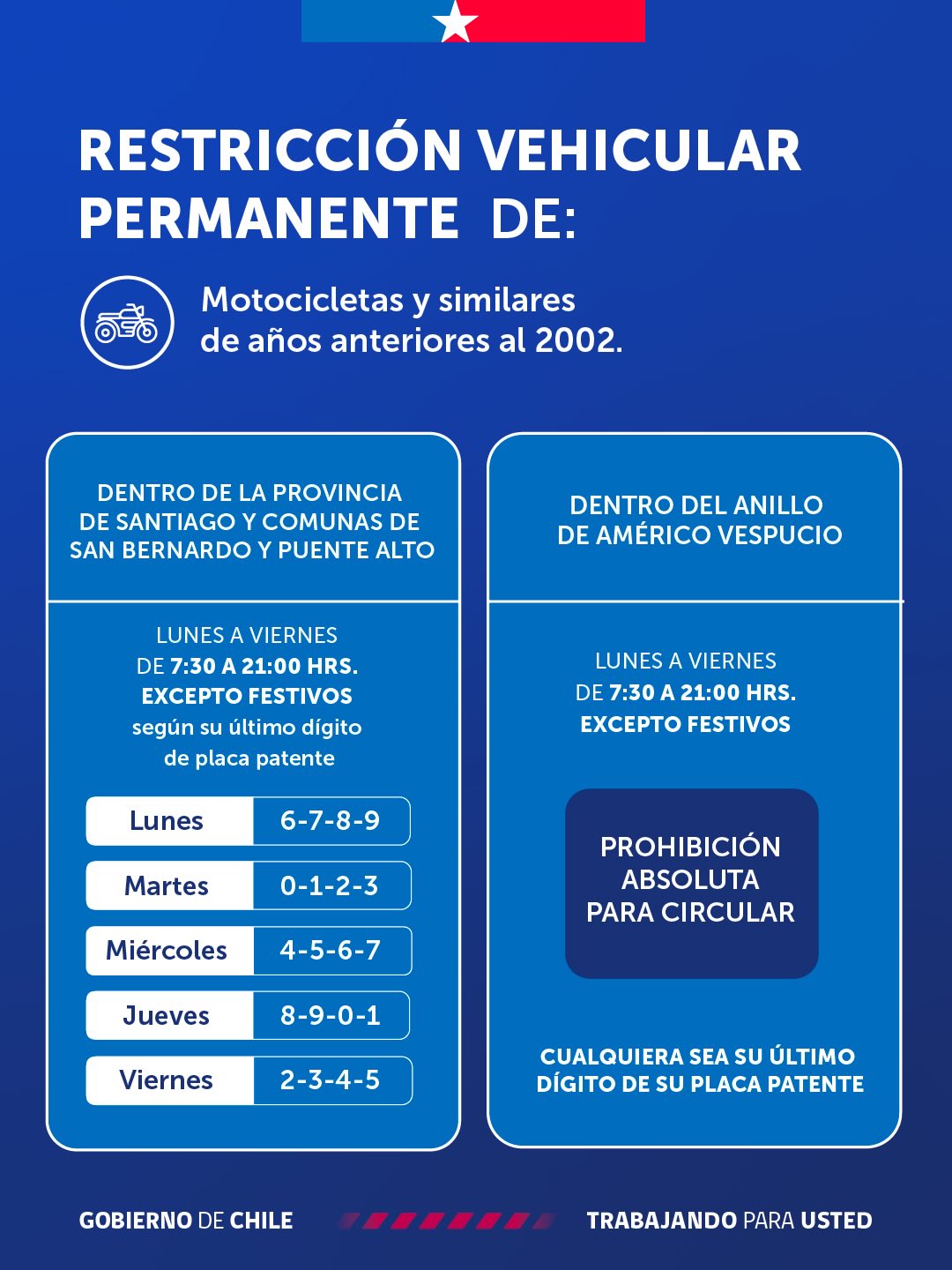 Las motos anteriores a 2002 no podrán circular dentro del anillo Américo Vespucio. En tanto, habrá calendario de cuatro dígitos para circular en el resto de la provincia de Santiago más las comunas de San Bernardo y Puente Alto.