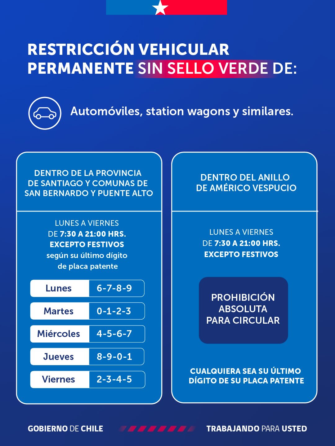 La restricción vehicular rige de lunes a viernes, excepto festivos, hasta el 31 de agosto. El horario es de 7:30 de la mañana a 21:00. En tanto, la multa por no respetar esta medida es de 1 a 1,5 UTM, o sea, desde los $70.588 a los $105.882 (valor de mayo).
