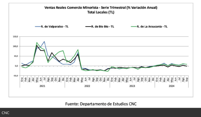 El comercio minorista tuvo un septiembre favorable en Valparaíso y La Araucanía, con crecimientos del 8,3% y 8,1% respectivamente, mientras que en la Región del Biobío las ventas cayeron un -1,3%. Factores como las Fiestas Patrias, el turismo argentino y una menor base comparativa impulsaron las ventas, aunque un efecto calendario negativo también se hizo presente en los resultados. A pesar de mejoras en rubros como Vestuario y Línea Hogar, se observa una tendencia plana a nivel trimestral, lo que indica desafíos persistentes en la recuperación del consumo. La gerente de Estudios de la CNC destaca la importancia de recuperar la inversión, brindar seguridad y certezas, así como generar empleos formales y restaurar la confianza de empresarios y consumidores ante proyecciones de menor crecimiento para el próximo año.