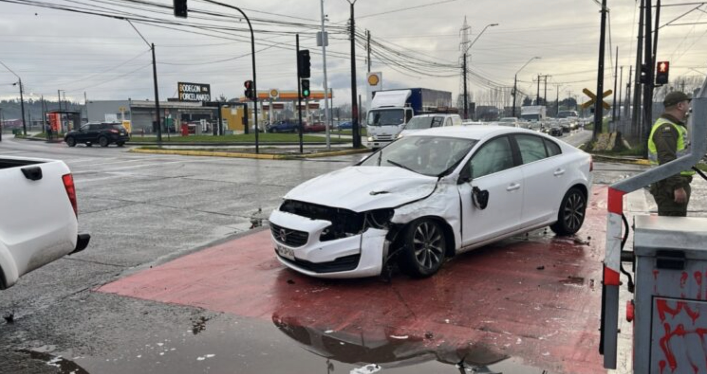 El accidente de tránsito ocurrió en el sector Paralelas de Coronel, donde el tren impactó con un vehículo color blanco. Tras lo ocurrido, el automóvil está detenido en el cruce.