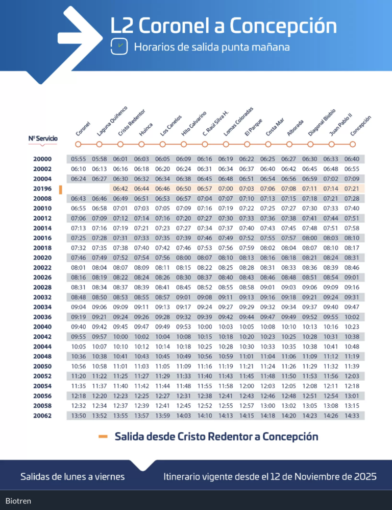 Respecto a las salidas desde Concepción a Coronel en horario punta de la mañana, de lunes a viernes, el primer servicio 20001 saldrá a las 06:45 horas, suprimiendo el 20005 que salía a las 06:53 horas.