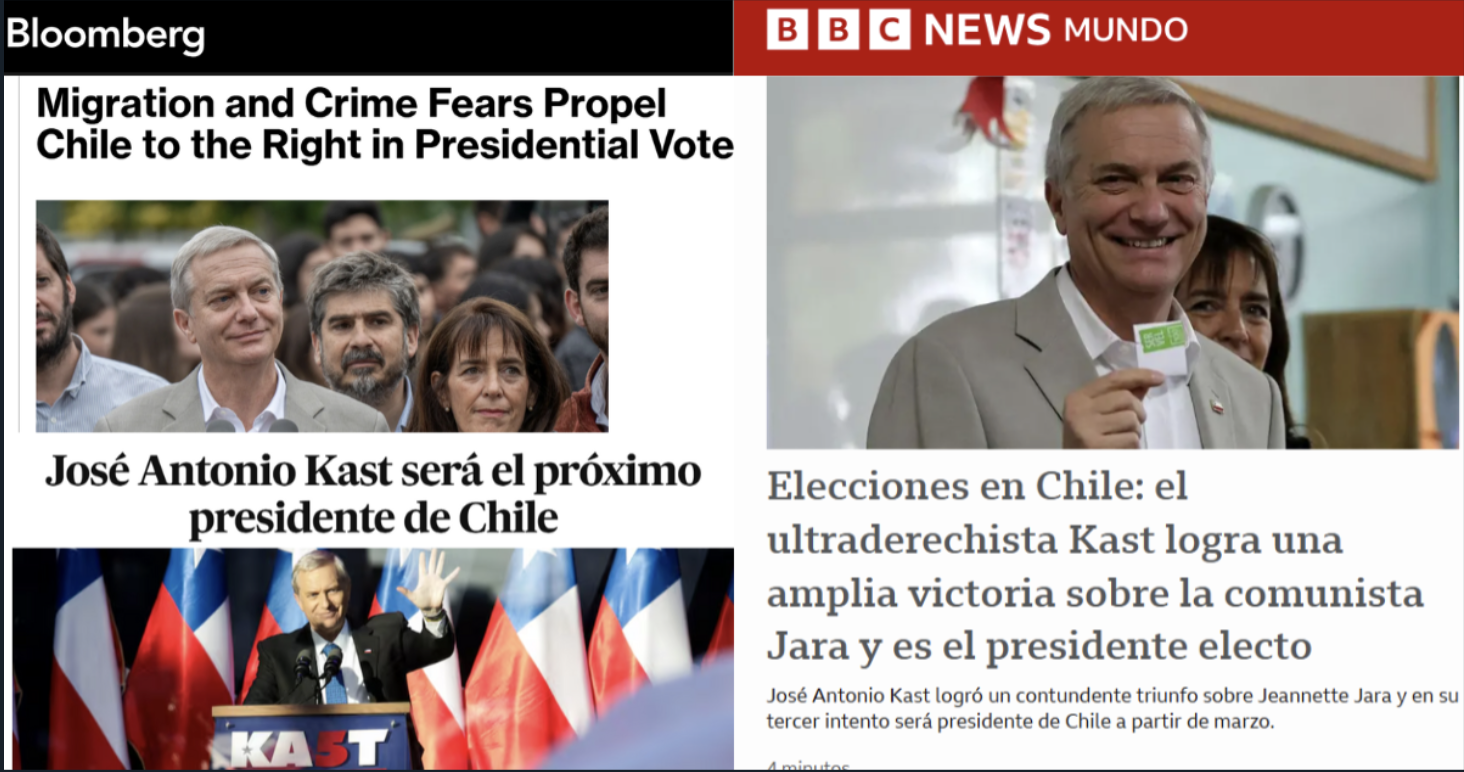 Por otro lado, la BBC expuso: “El ultraderechista Kast logra una amplia victoria sobre la comunista Jara y es el presidente electo”.