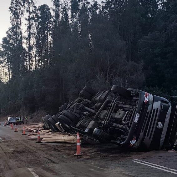 Un camión terminó volcado la madrugada de este lunes en la Ruta de la Madera, en la región del Biobío.
