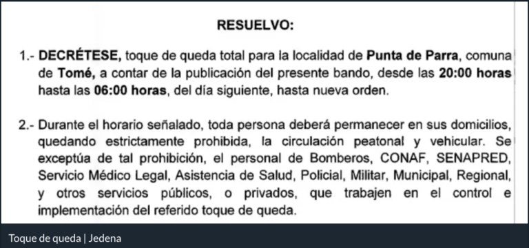 Nueva comuna en toque de queda en el Biobío tras incendios forestales. Punta de Parra se une a las medidas de seguridad por devastador fuego. Zona afectada y con una víctima fatal. Jefe de Defensa Nacional confirma restricción de movilidad desde el miércoles 21 de enero, de 20:00 a 06:00 horas.