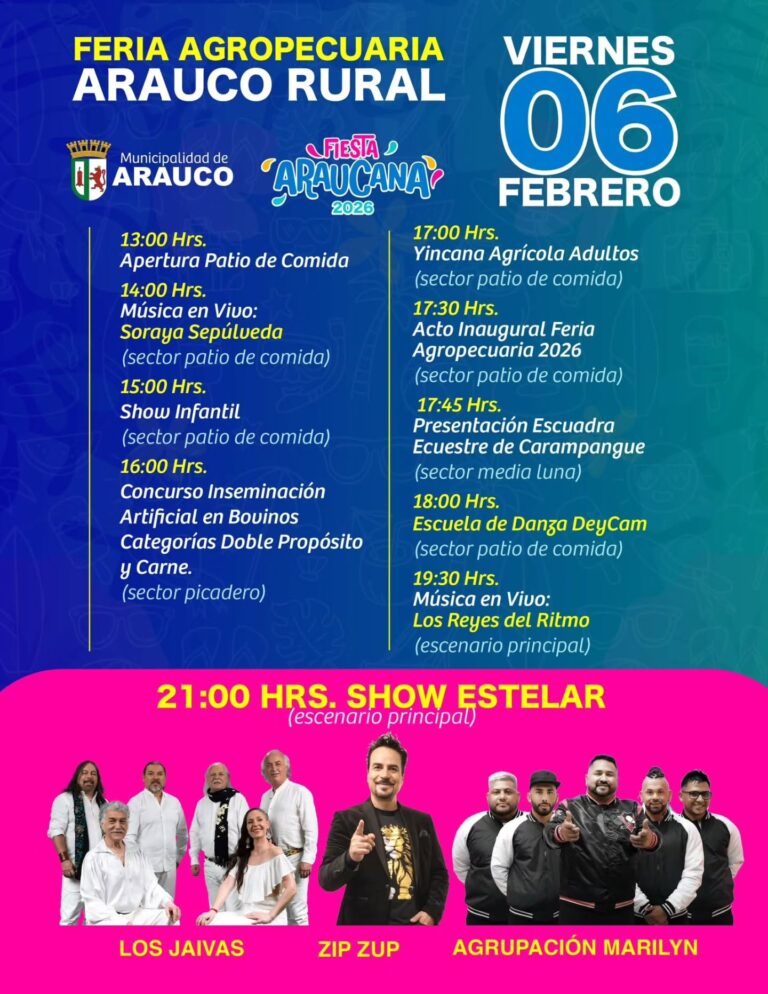 Mientras que Arauco se prepara para vivir una de sus celebraciones más esperadas, la Fiesta Agropecuaria Arauco 2026. Un evento contará con cocinerías, artesanos, cervecerías artesanales y artistas confirmados desde el hoy viernes 6 hasta el domingo 8 de febrero.