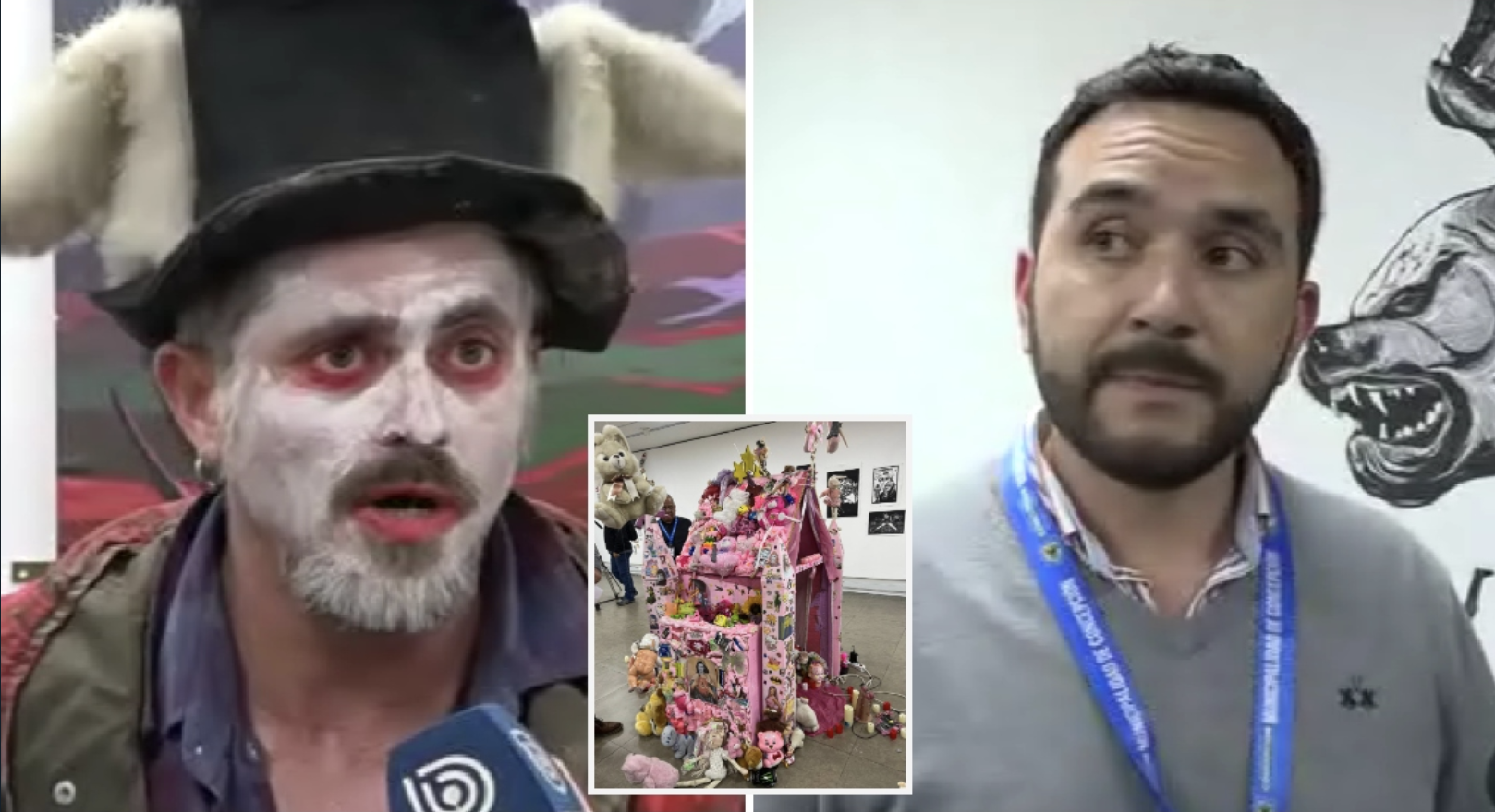 Ante los cuestionamientos por el contenido de la obra, el municipio resolvió cancelar la muestra y esta jornada convocó un punto de prensa para explicar las razones que los llevaron a tomar esta determinación, pero al lugar llegó uno de los artistas involucrados, quien se identificó como Huachistáculo.