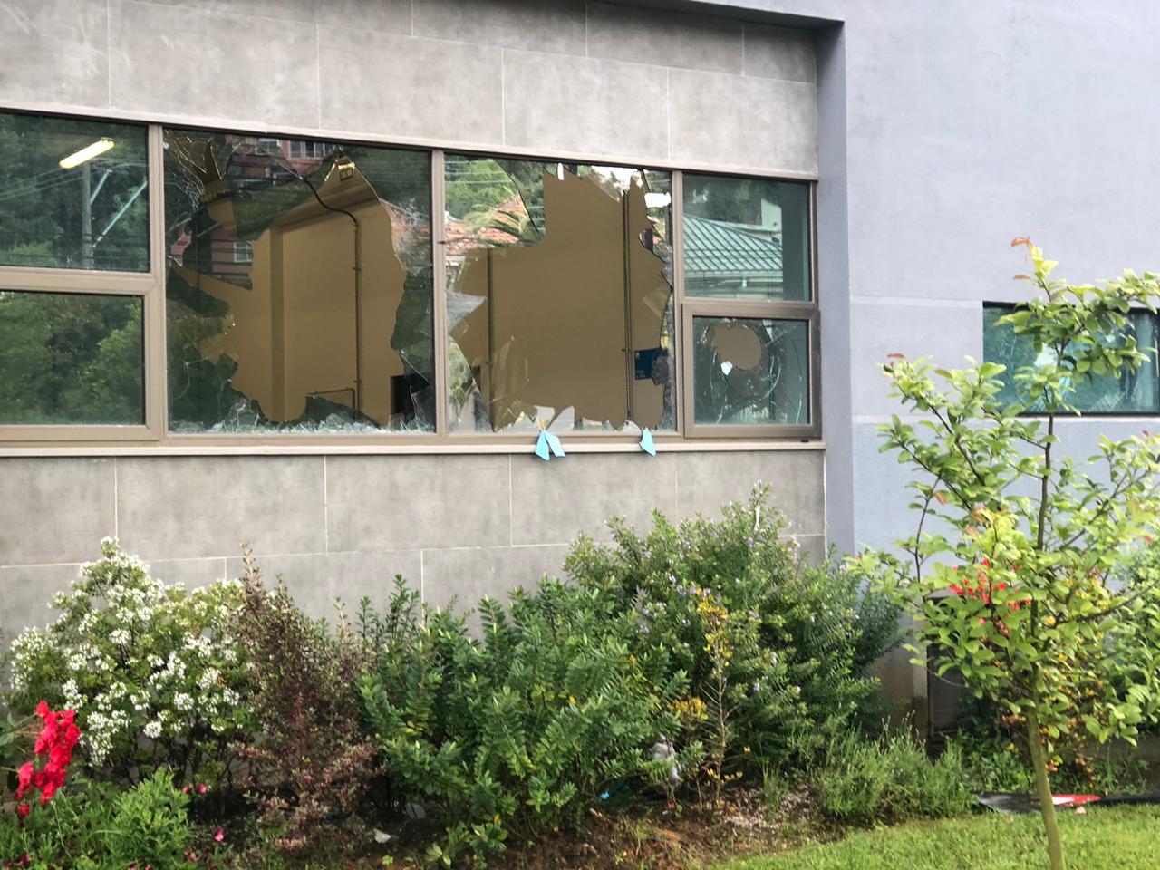 Al menos siete ventanales terminaron dañados, cuatro de ellos resultaron totalmente destruidos.